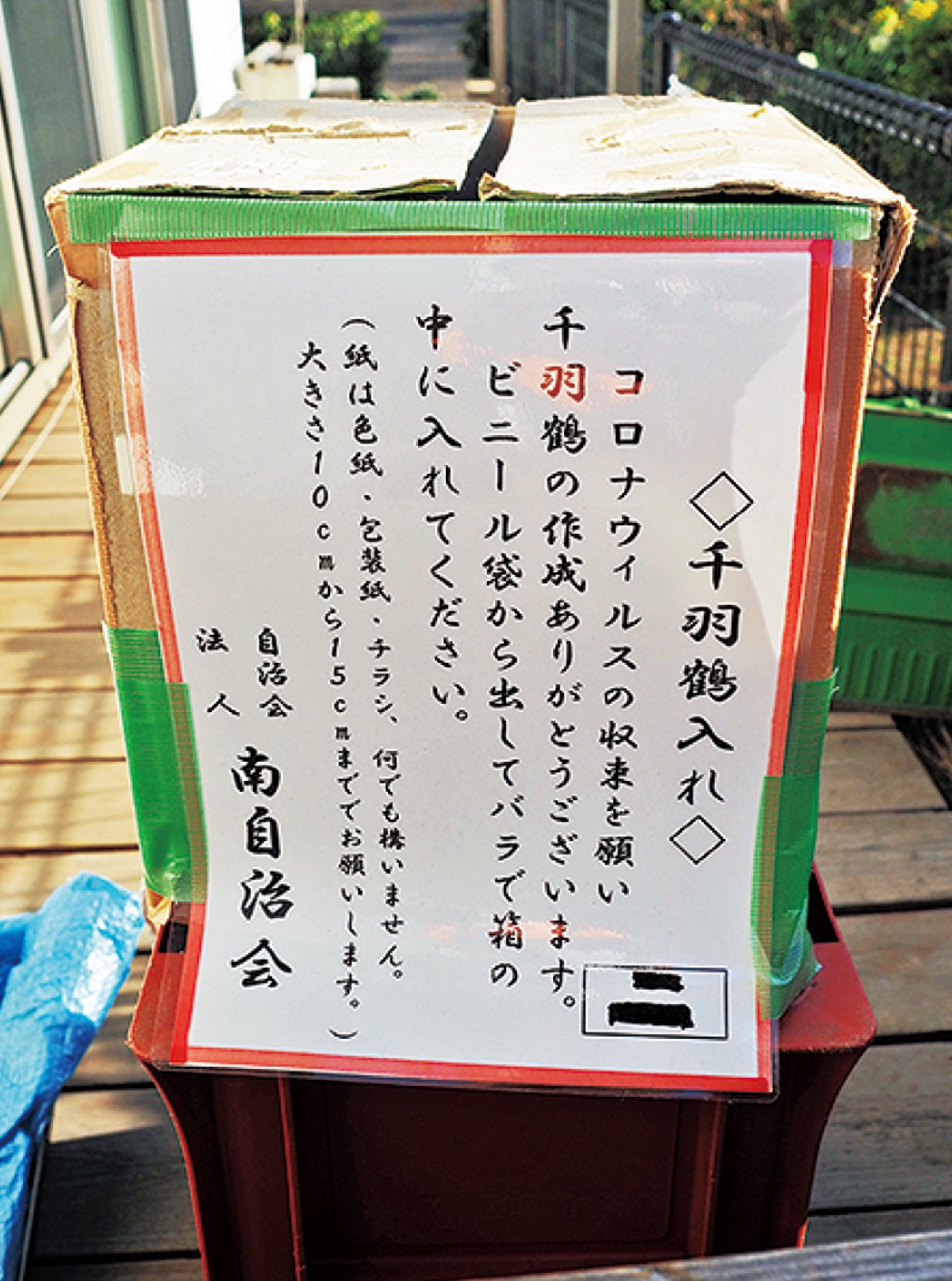 そこで思い付いたのが「コロナウイルスの収束を願う」千羽鶴の制作。上鶴間小学校「見守り隊」のボランティアとしても活動する浅田会長。毎朝、登校の際に顔を合わせる児童たちに話をし、協力を呼び掛けた。すると次々と「やりたい」の声が上がり、12人から折り鶴が届けられた。さらに近隣にも活動が広がったため、いつでも入れられるようにと、自治会館に「折り鶴ポスト」も設置した。