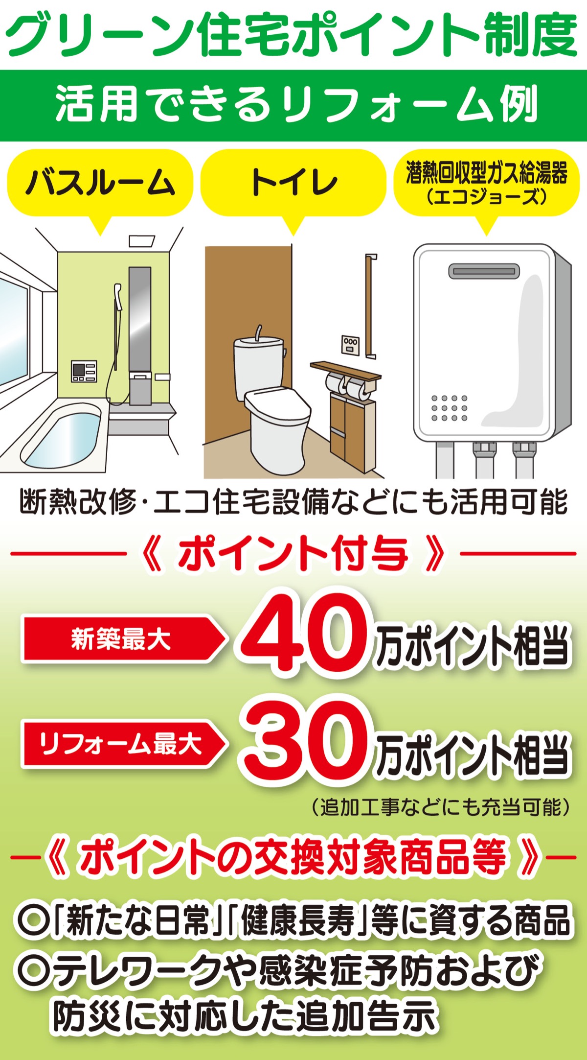 高い省エネ性能を持つ住宅購入や追加工事、新型コロナ対応リフォームなどの多岐にわたって交換可能なポイントが付与される国の「グリーン住宅ポイント制度」を賢く利用してお得なリフォームを。最大で30万ポイント相当の付与が受けられるので要チェックだ。