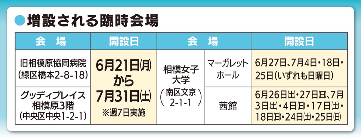 臨時の集団接種会場も増設。旧相模原協同病院(緑区)、グッディプレイス相模原3階(中央)、相模女子大学内のマーガレットホールと茜館(南区)が新たに加わる。接種を実施する期間は旧相模原協同病院とグッディプレイス相模原が6月21日(月)から7月31日(土)までの毎日で、相模女子大学は1回目の接種が6月26日(土)・27日(日)・7月3日(土)・4日(日)。2回目が7月17日(土)・18日(日)・24日(土)・25日(日)。