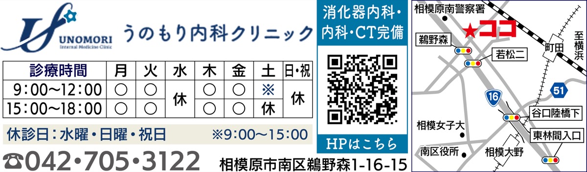 国道16号線・鵜野森交差点すぐそば、広い駐車場を完備し通院しやすい『うのもり内科クリニック(佐東丈仁院長)』。佐東院長は北里大学医学部を卒業した地域密着の内視鏡専門医だ。
