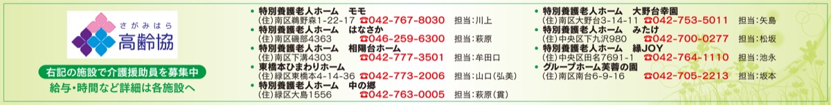 勤務時間は各施設と相談ということになりますが、午前中にリネン交換や掃除、お昼時の忙しい時間に食事の配膳など、直接、利用者の介護に携わることがないのが特徴です。現在、相模原市内では、以下の高齢者福祉施設が介護援助員を募集しています。ぜひ直接お問い合わせください。