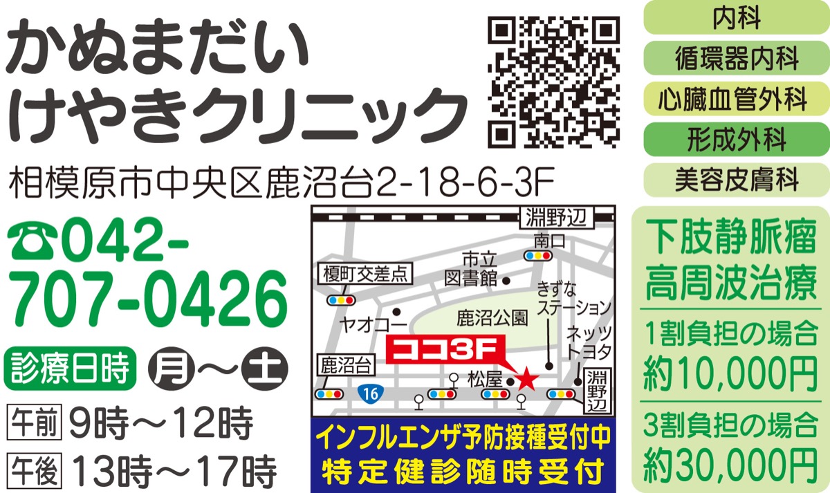 「地域を繋ぐ医療機関」を掲げる『かぬまだいけやきクリニック』(中央区鹿沼台)では「下肢静脈瘤(かしじょうみゃくりゅう)」の早期発見・治療に努めている。