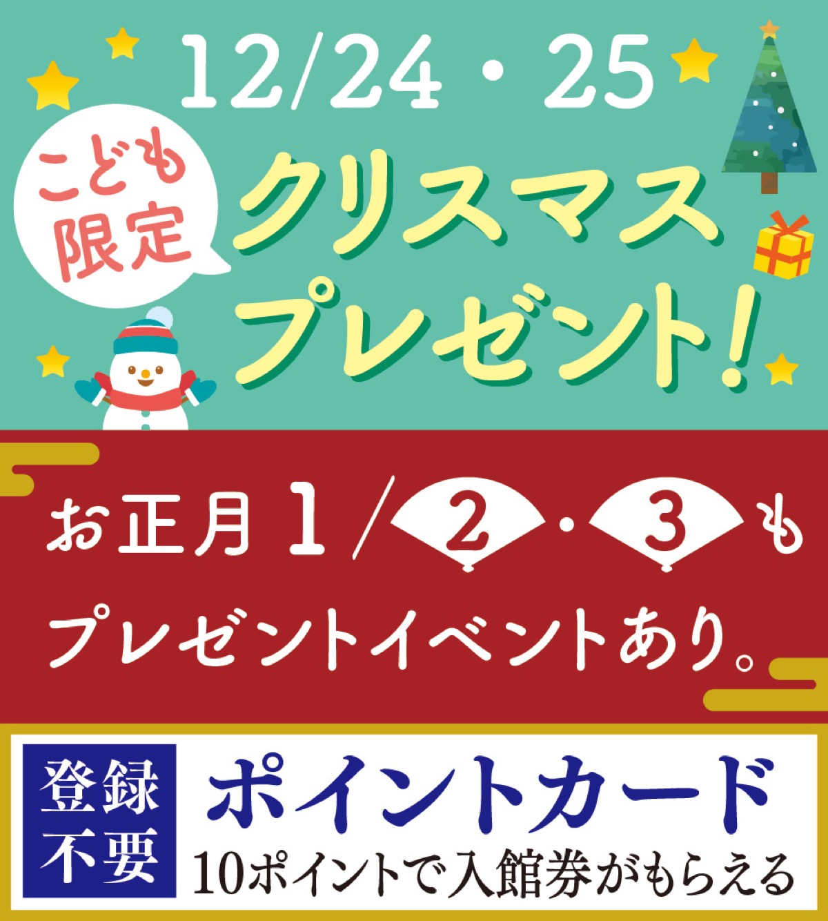 入館料3時間大人750円・小学生380円。平日夜間料金有。(営)10時〜21時(水曜、元日休)。詳細は左記へ。