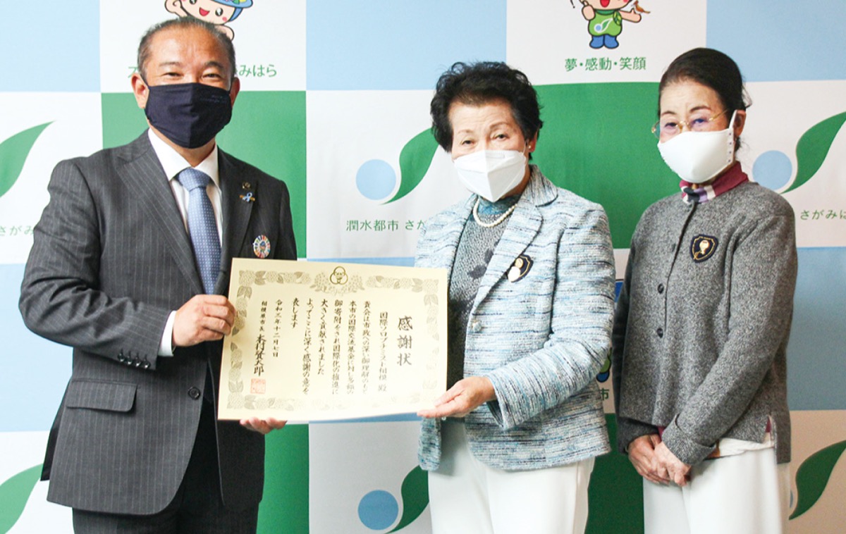 女性の人権・地位向上をめざして活動している奉仕団体の国際ソロプチミスト相模(山田洋子会長)は、市国際交流基金へ寄付したことを受け12月7日に本村賢太郎市長から感謝状を贈られた。