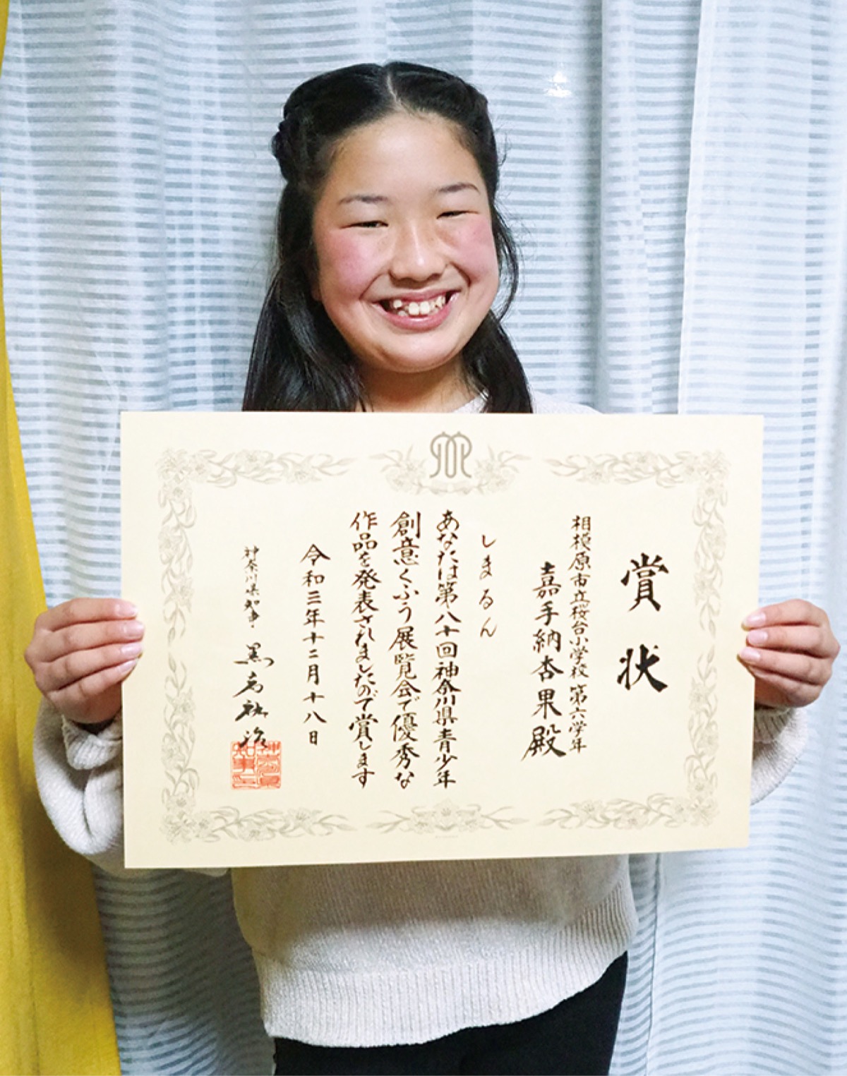 次代を担う青少年に発明や工夫する楽しさ、創作する喜びを体得してもらい、創造性豊かな人間形成を目指して毎年開催されている「神奈川県青少年創意くふう展覧会」。その第80回の表彰式が昨年12月18日に横浜市で行われ、市立桜台小学校6年の嘉手納杏果(ももか)さんの作品「しまるん」が、神奈川県知事賞に輝いた。