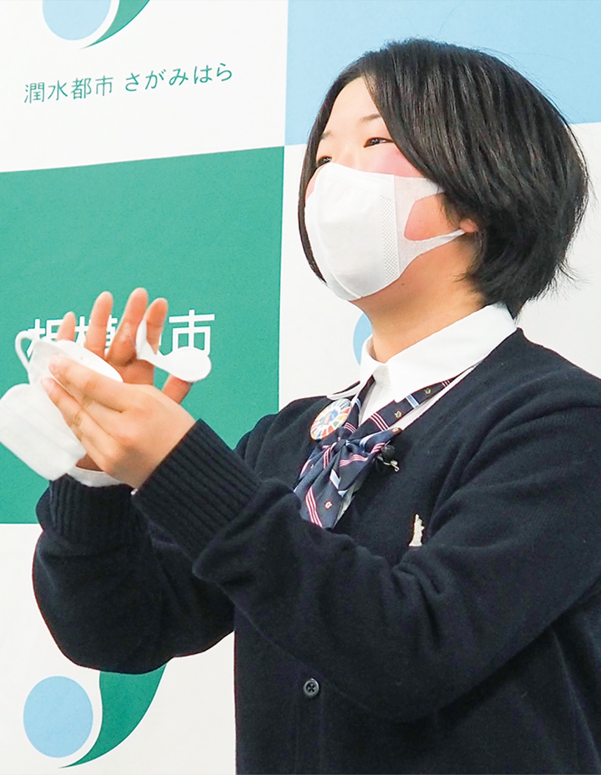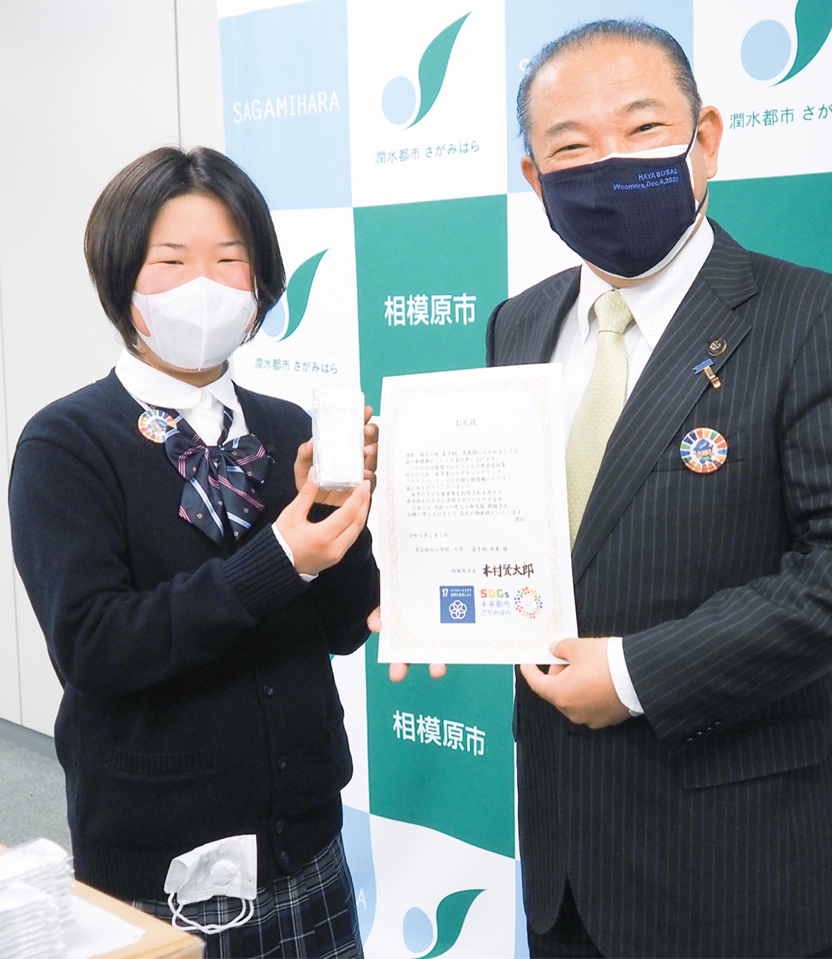自らが発明し特許を取得した感染症対策物品「てりっぱ」を、市の新型コロナ対策に役立ててほしいと、桜台小学校6年の嘉手納杏果さん(12)が7日、相模原市役所を訪問。本村賢太郎市長に1000個を手渡した。市では、「大変ありがたい。子ども食堂などでの活用を検討していく」と話している。