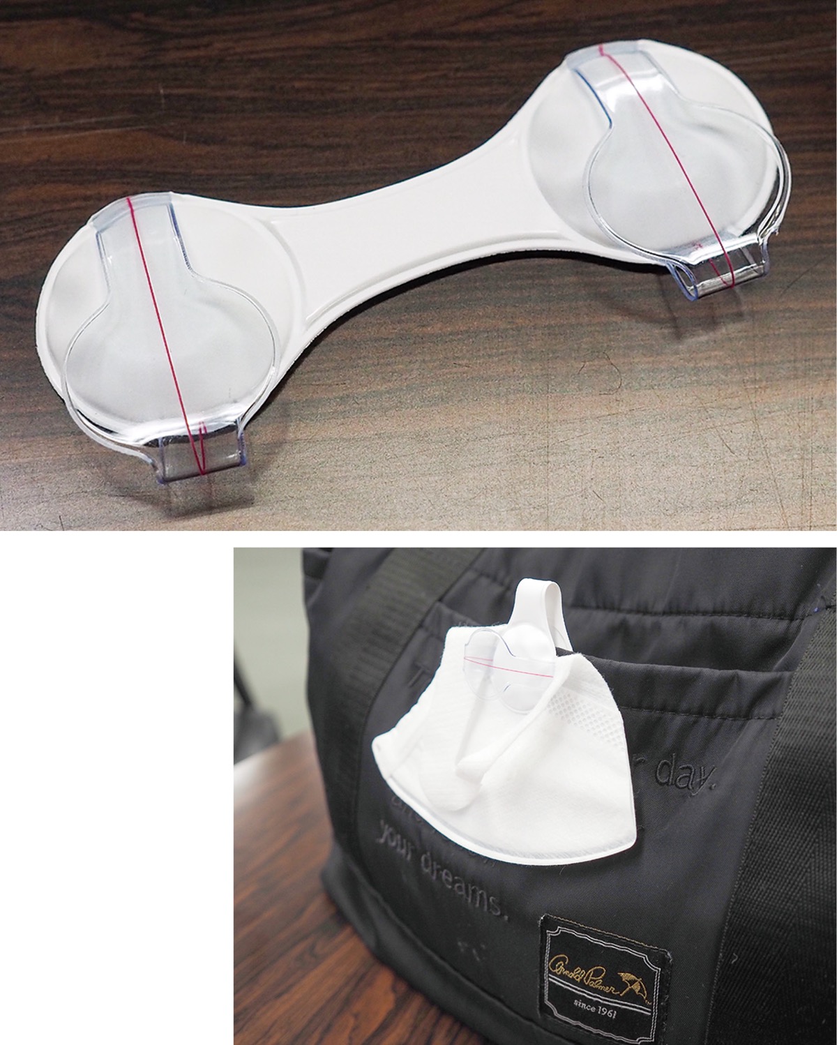 今回、嘉手納さんが発明した「てりっぱ」とは、長さ9センチほどのマグネットクリップ。内側に折りたたんだ使用中のマスクを、衣類の裾やバッグなどに手軽に保管できるようになっている。親指と人差し指を入れられるようにバンドをつけ、片手でも扱えるのが特徴だ。