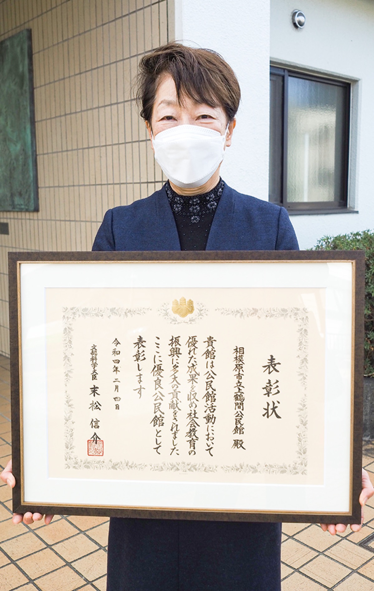 相模原市立上鶴間公民館(稲毛昜子館長)が「第74回優良公民館表彰」を受賞し、2月4日に文部科学省(東京都千代田区)で表彰式が行われた。今回表彰を受けたのは全国で59館。市内からは唯一、上鶴間公民館が選ばれた。