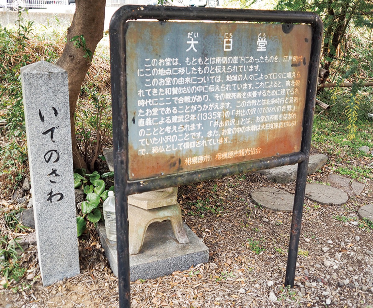 地域に伝わる逸話によれば、時代は鎌倉時代の末期。南朝と北朝と2つの朝廷が存続していた頃の1333年、新田時貞が鎌倉幕府・北条高時を攻め、これを滅亡させた。ところがその2年後、信濃に逃れていた高時の子・時行が鎌倉奪還を目指して諏訪頼重とともに蜂起。これを迎え撃つために出陣してきた足利直義(尊氏の弟)軍と、大激戦を展開したのが鎌倉街道の要衝「井出の沢(いでのさわ)」だった。結果は北条方が勝利し、足利勢は死体もそのままに鎌倉へ逃げ帰ったと伝えられてきた。これが「いでのさわの戦い」のあらましで、大日堂はその際の戦死者を村人が葬った寺として建立されたそうだ。