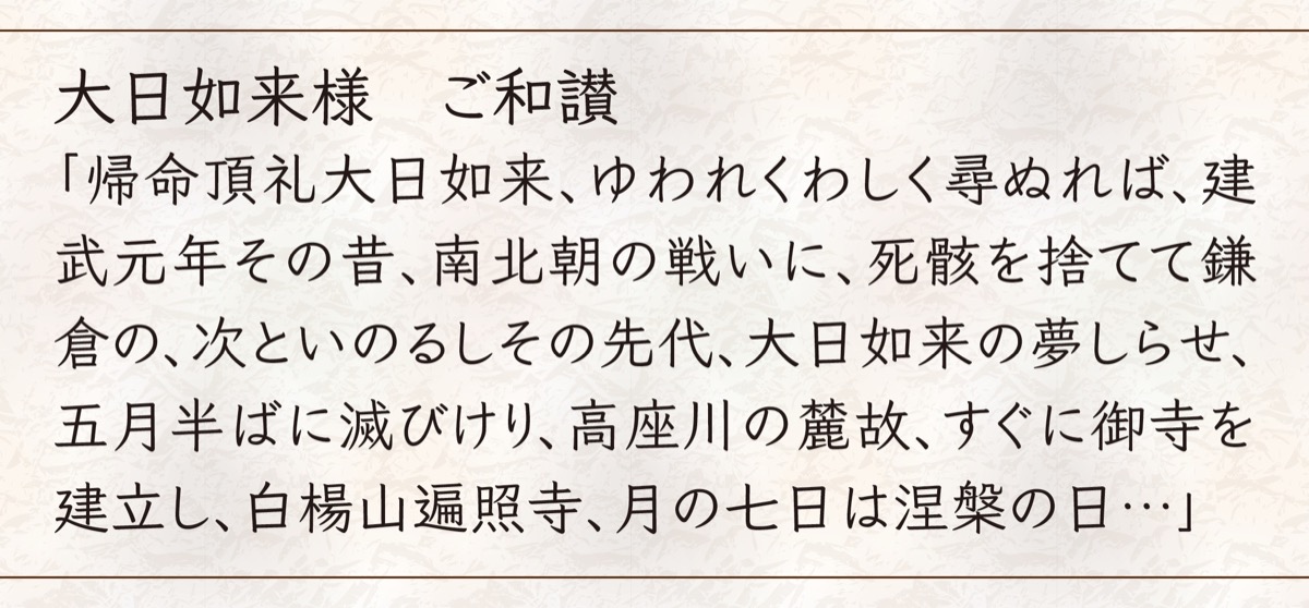 これらの縁起を裏付けるのが、大日堂に古くから伝わる「大日如来様 ご和讃」=下記=。この中に出てくる先代とは北条時行、高座川は境川とされる。大日堂は、江戸時代には白楊山遍照寺という真言宗の尼寺で、最後の庵主が亡くなると廃寺となり、現在の地に移されたといわれている。
