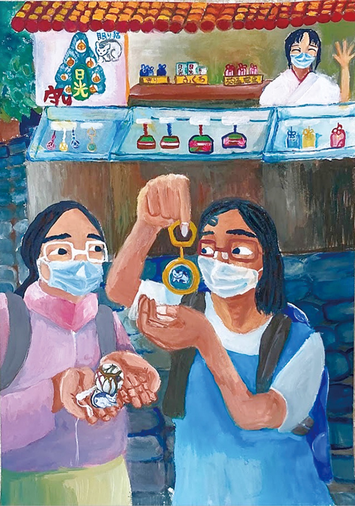 受賞作品のタイトルは「日光の思い出見せ合いっこ」。修学旅行で訪れた日光東照宮で、マスクをした2人の女児がお土産の御守を見せ合いしている姿を鮮やかな水彩で描いている。「コロナ禍で様々な制約がある中でも、修学旅行に行けたことが本当にうれしかった」と話す山添さん。夏休み前からアイデアを練り、構図や色合いなど何度も直しながら描き上げた作品だ。