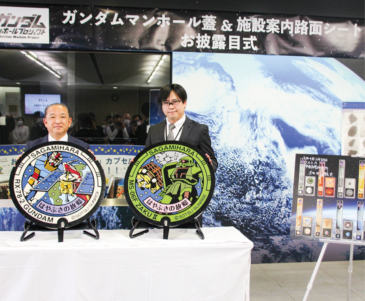 3月28日には市役所でマンホール蓋のお披露目式を開催。覆われていた幕が取り除かれガンダムとザクIIのデザインが姿を見せると関係者から拍手が起こった。本村賢太郎市長は自身が40年来のガンダムファンであることを明かすと、「数年前から部署を横断して取り組みを進めてきた。お披露目できて大変うれしい」と話し、下水道事業の啓発と相模原市のPRに期待感を示した。来賓として出席したJAXA宇宙科学研究所の細田聡史さんも「ガンダム世代ど真ん中」と自称し、マンホール蓋のデザインの考案にも即座に手を挙げたエピソードを紹介。「非常に格好よくユニークなものができ、感動している」とうれしそうに話し、「これを機に、我々の宇宙科学の活動やインフラを支える活動が注目を浴びていけば」と述べた。