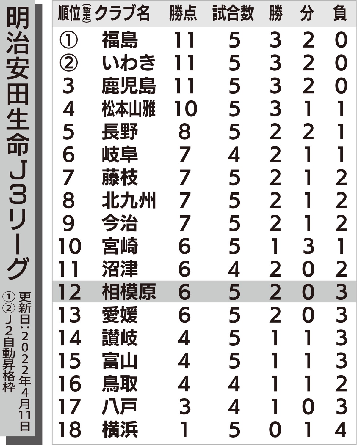 サッカーJ3・SC相模原は4月10日、アウェーで愛媛FCと対戦し、1対2で逆転負けを喫した。