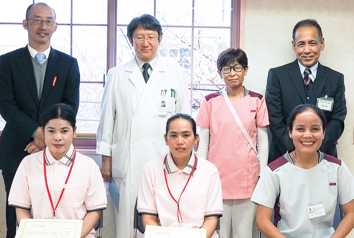 入職式には3人と、受け入れる相模原南病院の塚本真院長と杉本和子看護部長、老人ホームりんどう麻溝の岩崎義之施設長などが出席した。