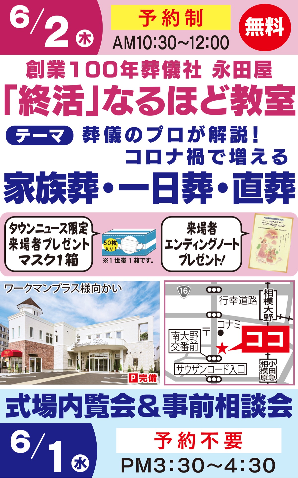 葬儀社・(株)永田屋の「終活」なるほど教室が6月2日(木)、メモリアルハウス小田急相模原で開かれる。参加無料。午前10時30分から正午。