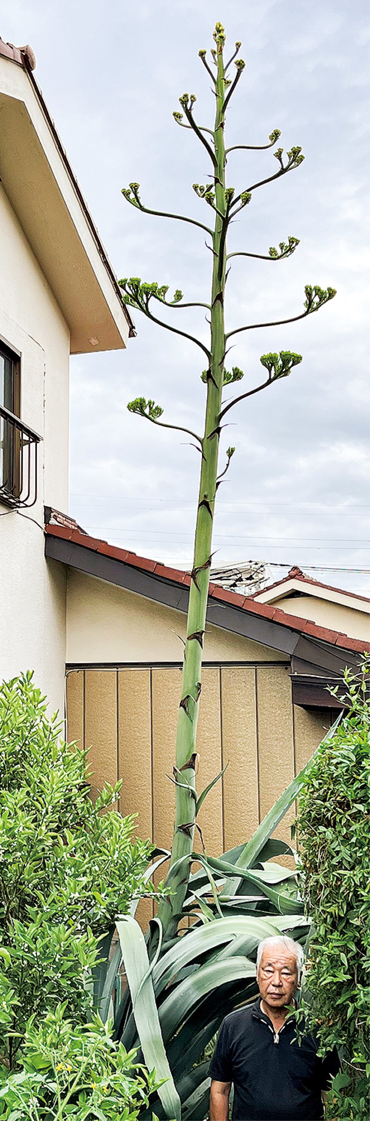 古淵在住の細谷正さん(80)の自宅の庭にあるリュウゼツランの開花が迫っている=写真(6日撮影)。「50年に一度咲く」という珍しい花で、細谷さんは52年ほど育てて初めて茎が伸び始めたという。細谷さんは「ようやく見られる」と開花を待ち望んでいる。