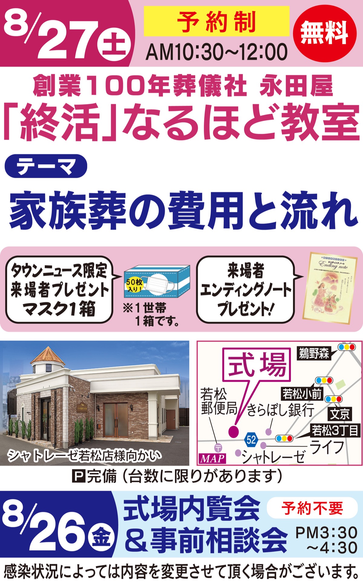 グーグルのクチコミ件数で神奈川県第一位の葬儀社・(株)永田屋の「終活」なるほど教室が8月27日(土)、小さな家族葬ハウス®若松で開かれる。参加無料。午前10時30分から正午。予約制。