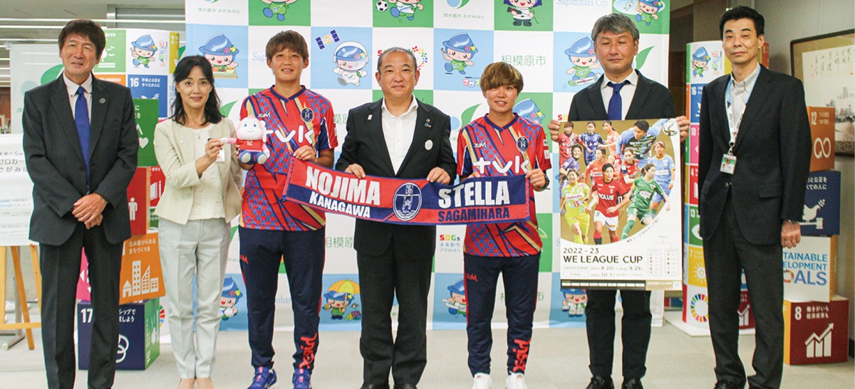 女子サッカーのノジマステラ神奈川相模原の馬場正臣社長らが8月10日、10月の新シーズン開幕を前に本村賢太郎市長を表敬訪問した。