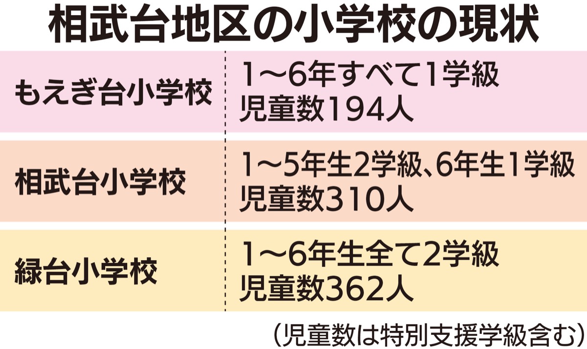 相武台地区では大規模団地の年齢構成の上昇により1981年頃をピークに児童数が減少。2001年には北相武台小学校と磯野台小学校を統合し、もえぎ台小学校が開校したばかりだ。