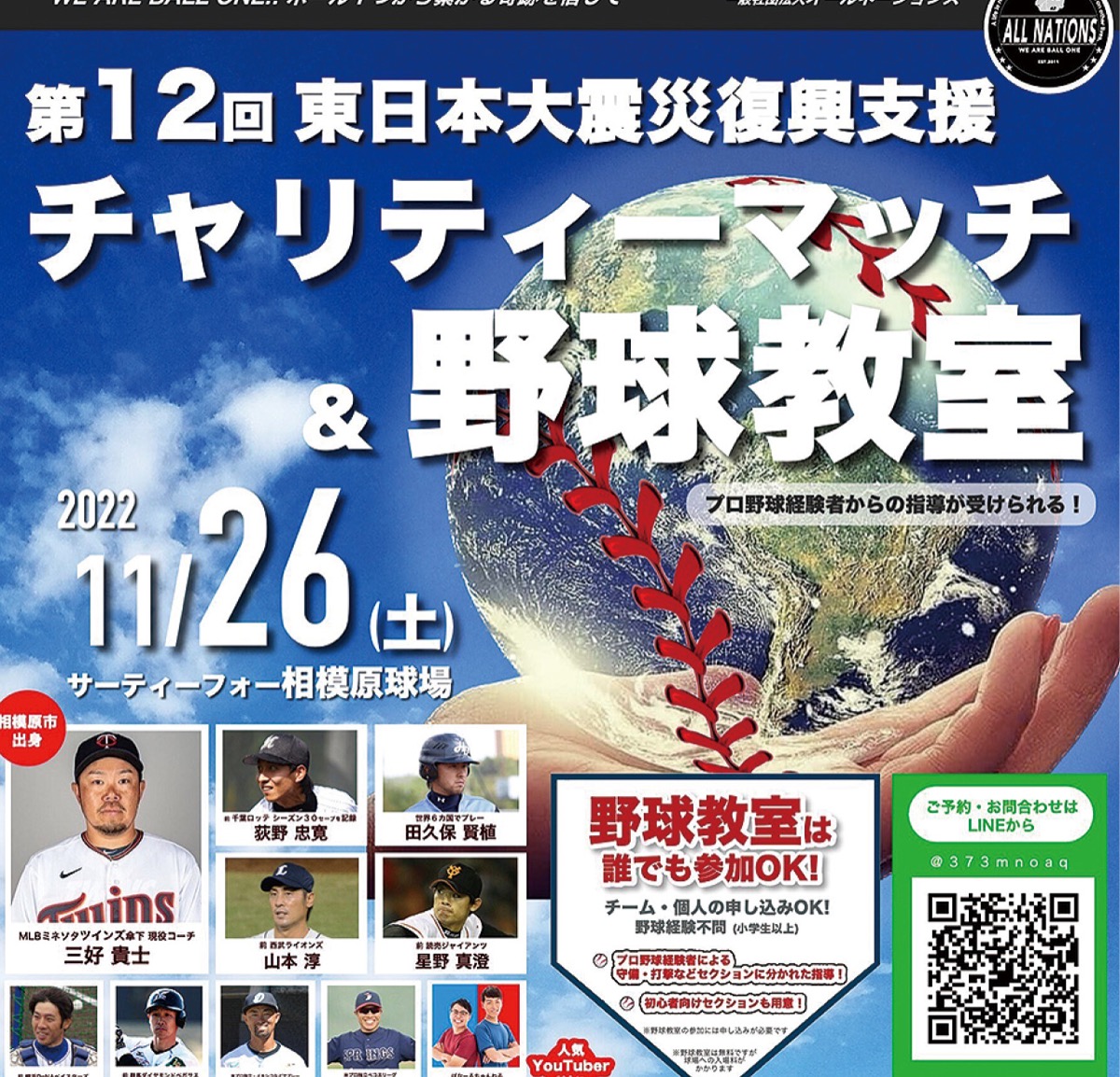 プロ野球OBや経験者、現役選手が参加するチャリティーマッチが11月26日(土)、サーティーフォー相模原球場(中央区弥栄3の1の6)で開催される。午前9時30分開場、11時試合開始。(一社)オールネーションズ、(公財)相模原市まち・みどり公社の共催。