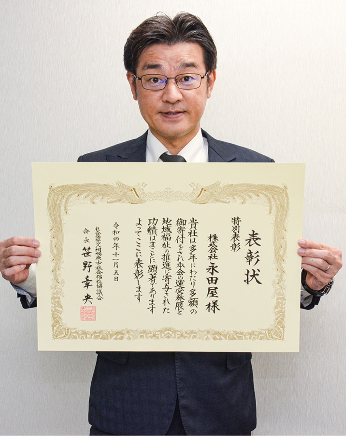 創業109年の地元葬儀社・株式会社永田屋(田中大輔代表取締役)は、地域福祉の推進に寄与したとして、このほど相模原市社会福祉協議会から特別表彰を受けた。