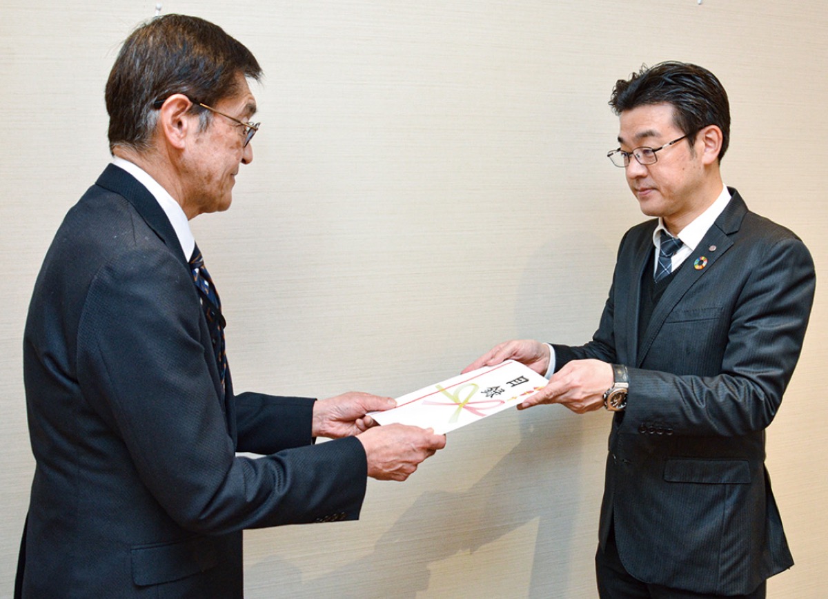この日は49万8831円を社協の笹野章央会長に手渡した。笹野会長は「人形を供養したいという方の需要に応え、さらにその浄財を寄付していただけるというのは大変ありがたい。その気持ちを受けて地域福祉の支援に無駄なく活用したい」と感謝。田中社長は「独居の高齢者へのサポートや子どもの居場所づくりなど社会福祉に役立ててもらえれば」と話した。