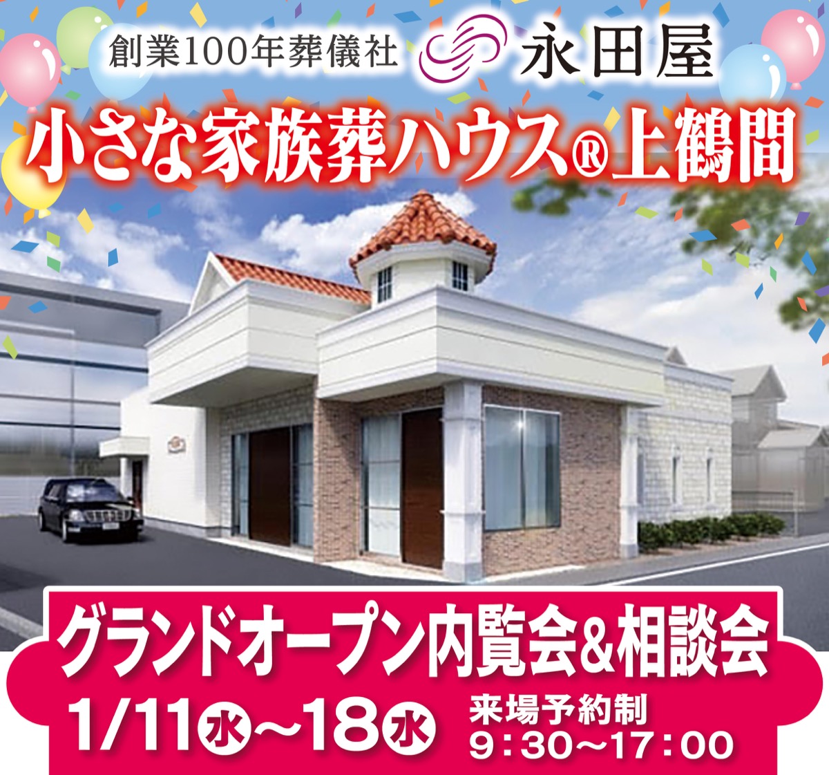 創業100年葬儀社の永田屋が手掛ける家族葬ホール「小さな家族葬ハウス上鶴間」がグランドオープン。1月11日(水)から18日(水)まで、内覧会&相談会を開催する。