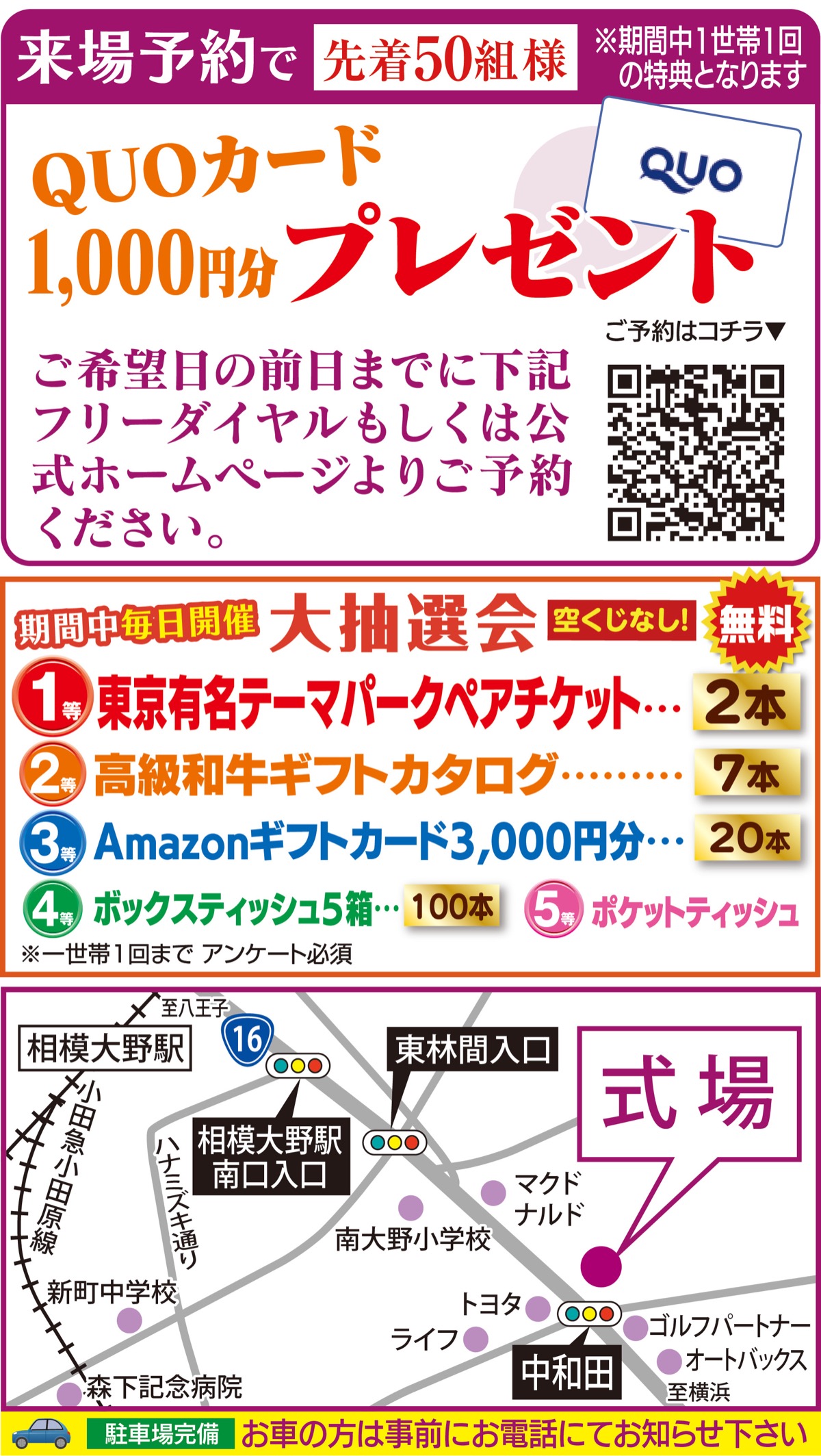 さらに、簡単なアンケートの記入で大抽選会に参加できる。1等は東京の有名テーマパークペアチケット、2等は高級和牛ギフトカタログなど嬉しい商品が満載。毎日開催で空くじなし(期間中1世帯1回)。
