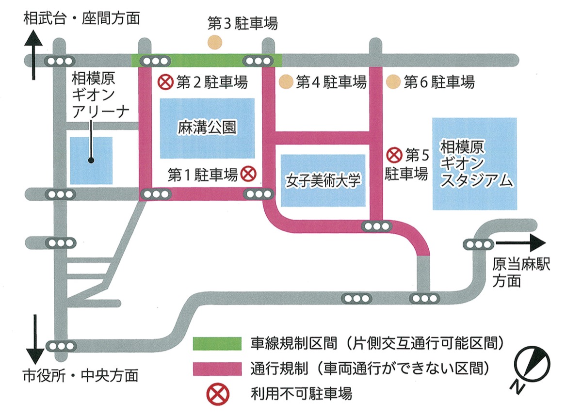 荒天の場合中止。なお当日は午前8時30分から正午頃まで、会場周辺の道路で通行規制が実施される。一部の路線バスの経路変更や車両通行できない区間があるため注意が必要。※右下図参照