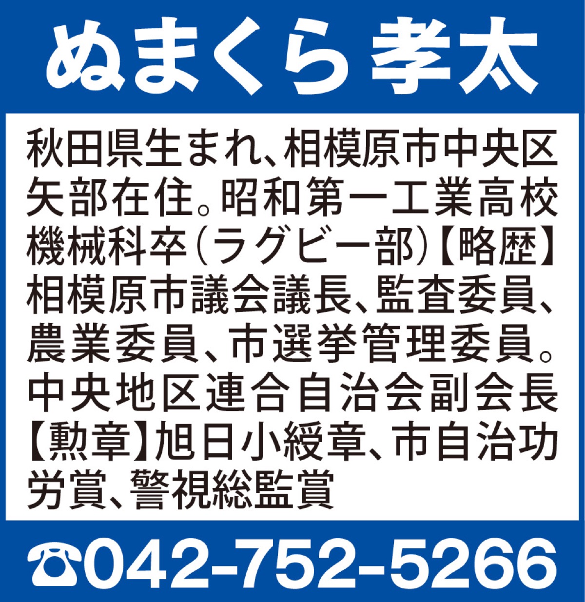 自由民主党相模原支部元幹事長 ぬまくら孝太