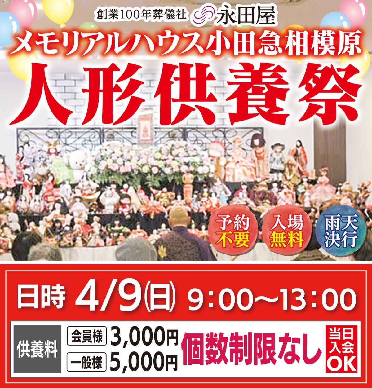 創業100年葬儀社の永田屋は4月9日(日)、午前9時から午後1時までメモリアルハウス小田急相模原で「人形供養祭」を開催する。予約不要で入場無料。雨天決行。