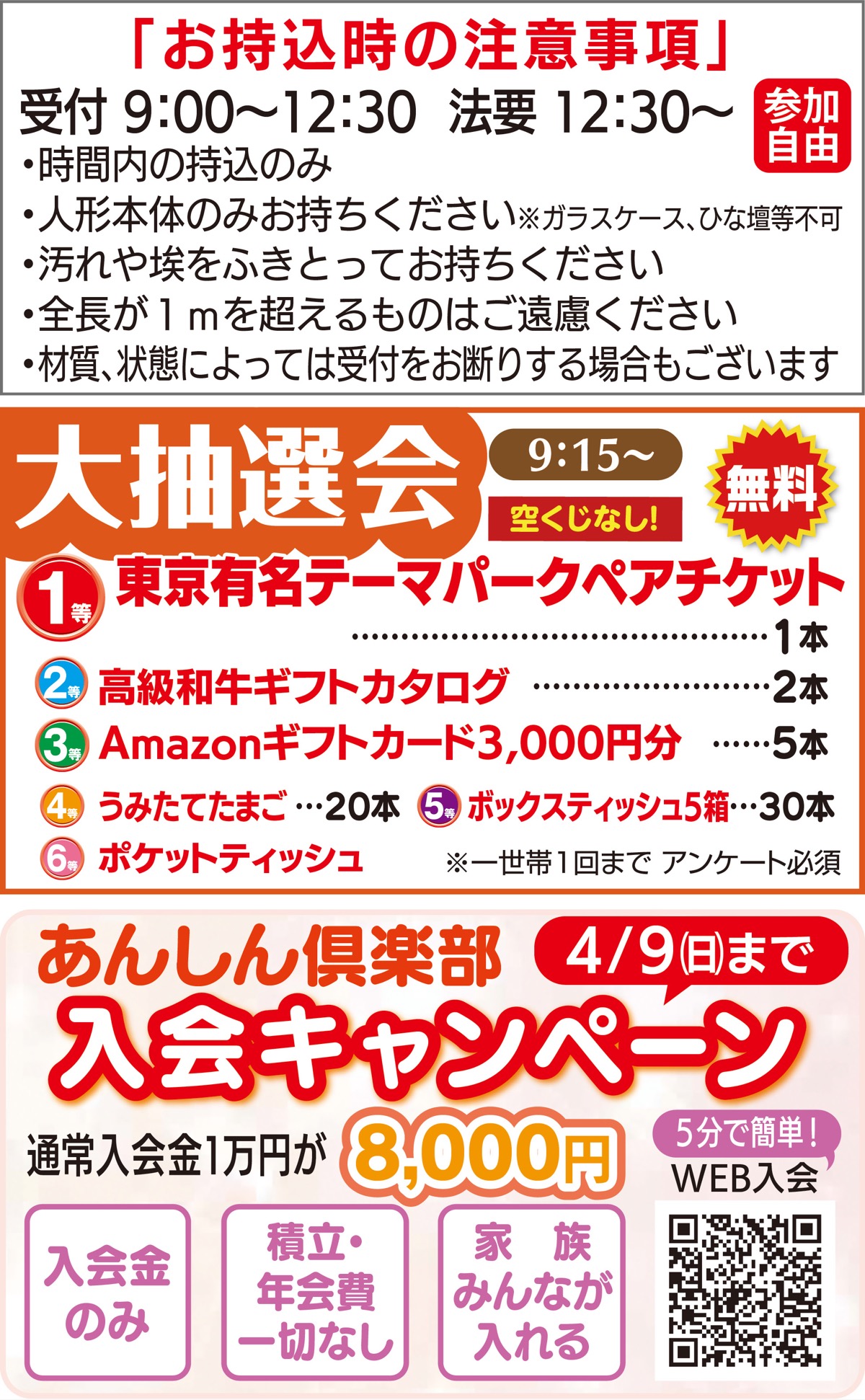 「お寺様による読経で大切なお人形をご供養しませんか」 4月9日