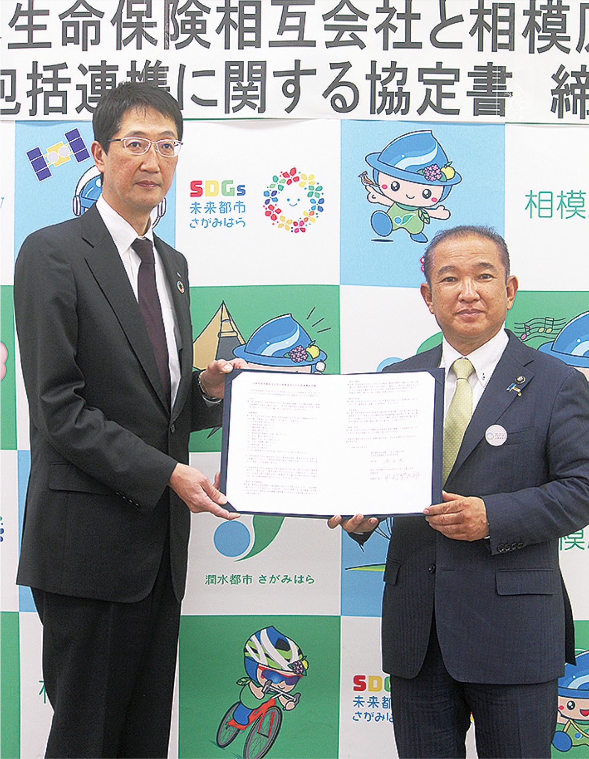 相模原市は日本生命保険相互会社と包括連携協定を締結した。締結式には同社町田支社の倉田剛支社長が訪れ、協定書にサインをした。