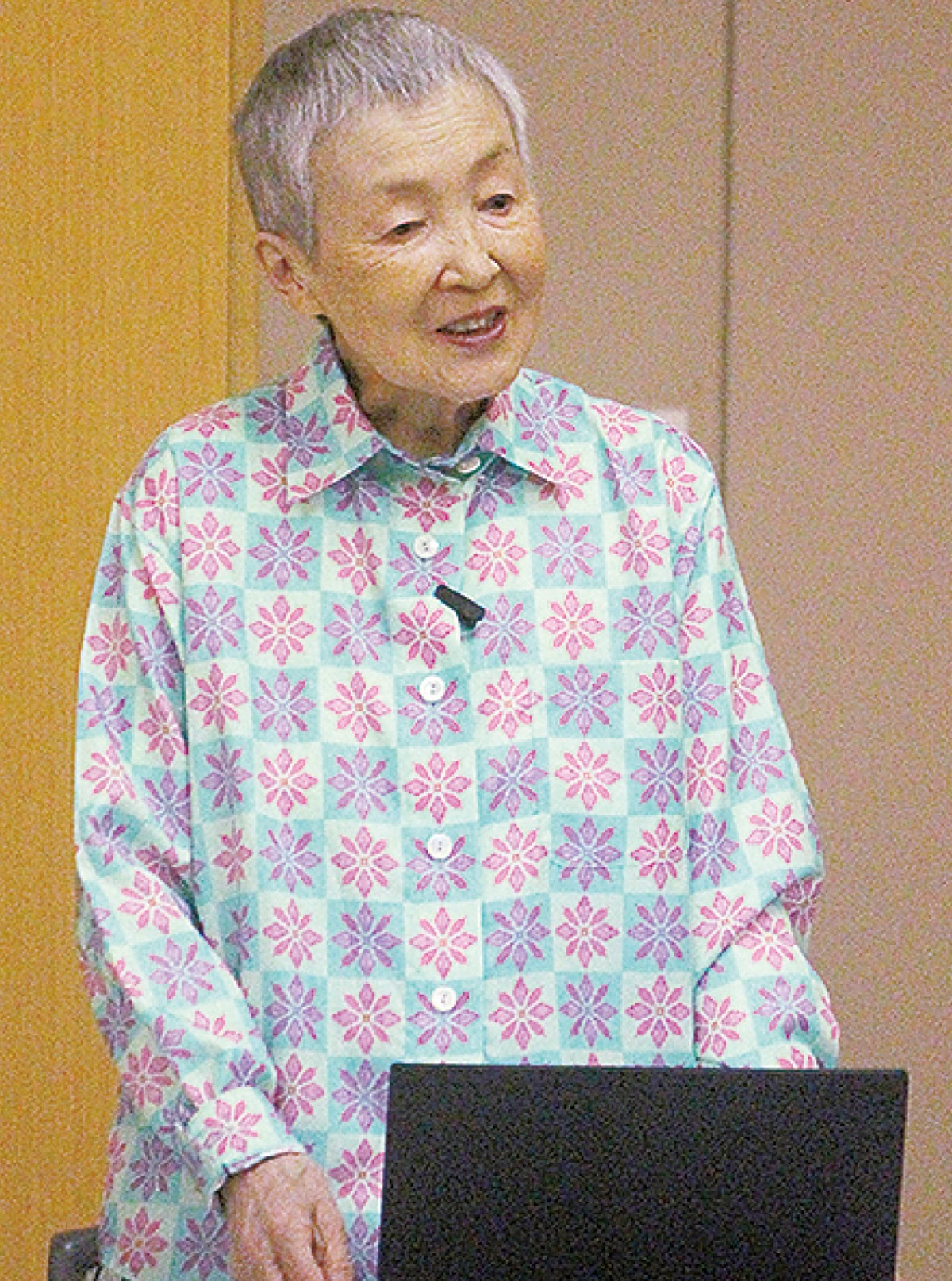 現在88歳の若宮さんは、自ら考案した表計算ソフトを使った「エクセルアート」でデザインしたブラウスを着て登壇。約1時間の講演中、立ったまま、58歳の時に独学でパソコンをはじめたことや高齢者に向けたアドバイスなどを話した。「スマホはお金のかかる『電話』ではなく、命綱であり、中央司令塔である『電脳万能小箱』」と持論を語り、高齢者にとっては使いづらい面もあるが、ぜひ活用をと促した。