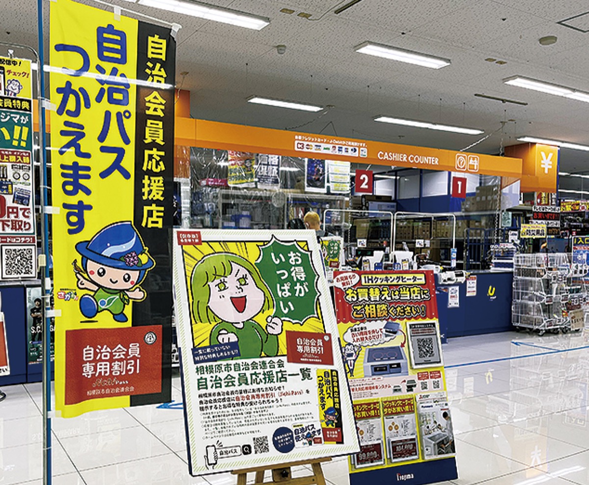 自治会員になるとお得がいっぱい--。相模原自治会連合会(竹田幹夫会長)が会員専用割引『自治パス』のPR強化に取り組んでいる。この春には割引などの特典が受けられる「応援店」を一覧できる冊子や、店舗に掲げる幟(のぼり)とステッカーを作成して、自治パスの普及と店舗の拡充に乗り出した。