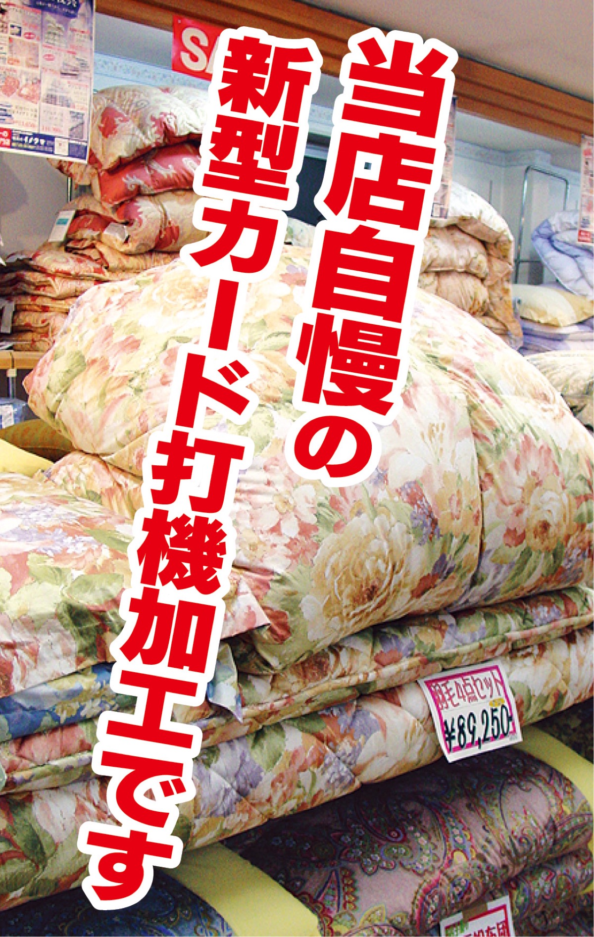 つぶれた綿の繊維を引き起こし、弾力性・保湿性・吸湿性に富んだふかふかのふとんに再生させる。しかも業界最新の「防ダニ・抗菌・防臭加工」だから、衛生面も安心だ。