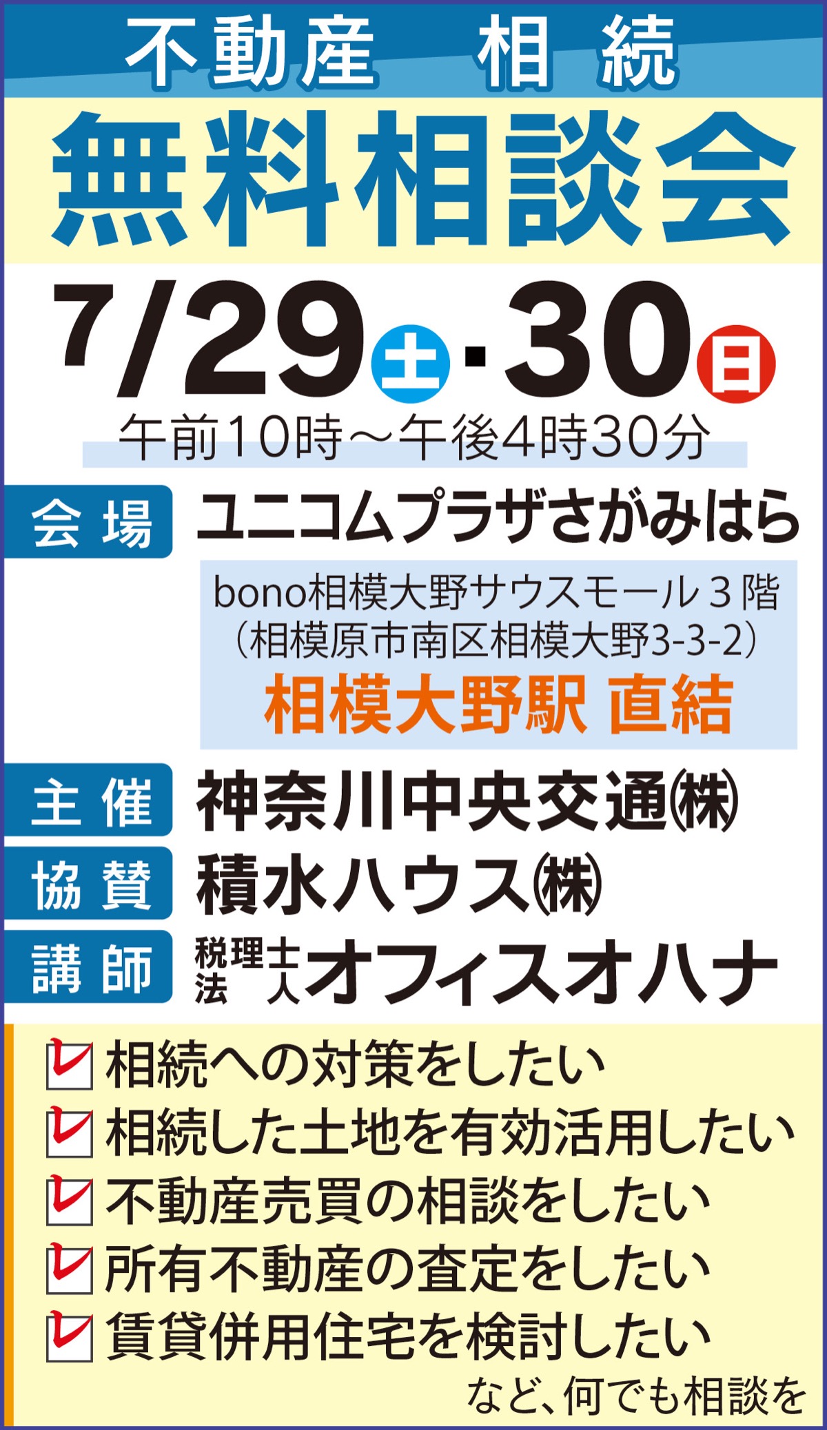 相続や不動産の悩みに税理士法人スタッフと宅建士ら専門家が応える無料相談会が7月29日(土)・30日(日)に相模大野駅前のユニコムプラザさがみはらで開かれる。主催は神奈中バスでおなじみ神奈川中央交通株式会社(積水ハウス協賛)。現在、参加者を募集中だ。
