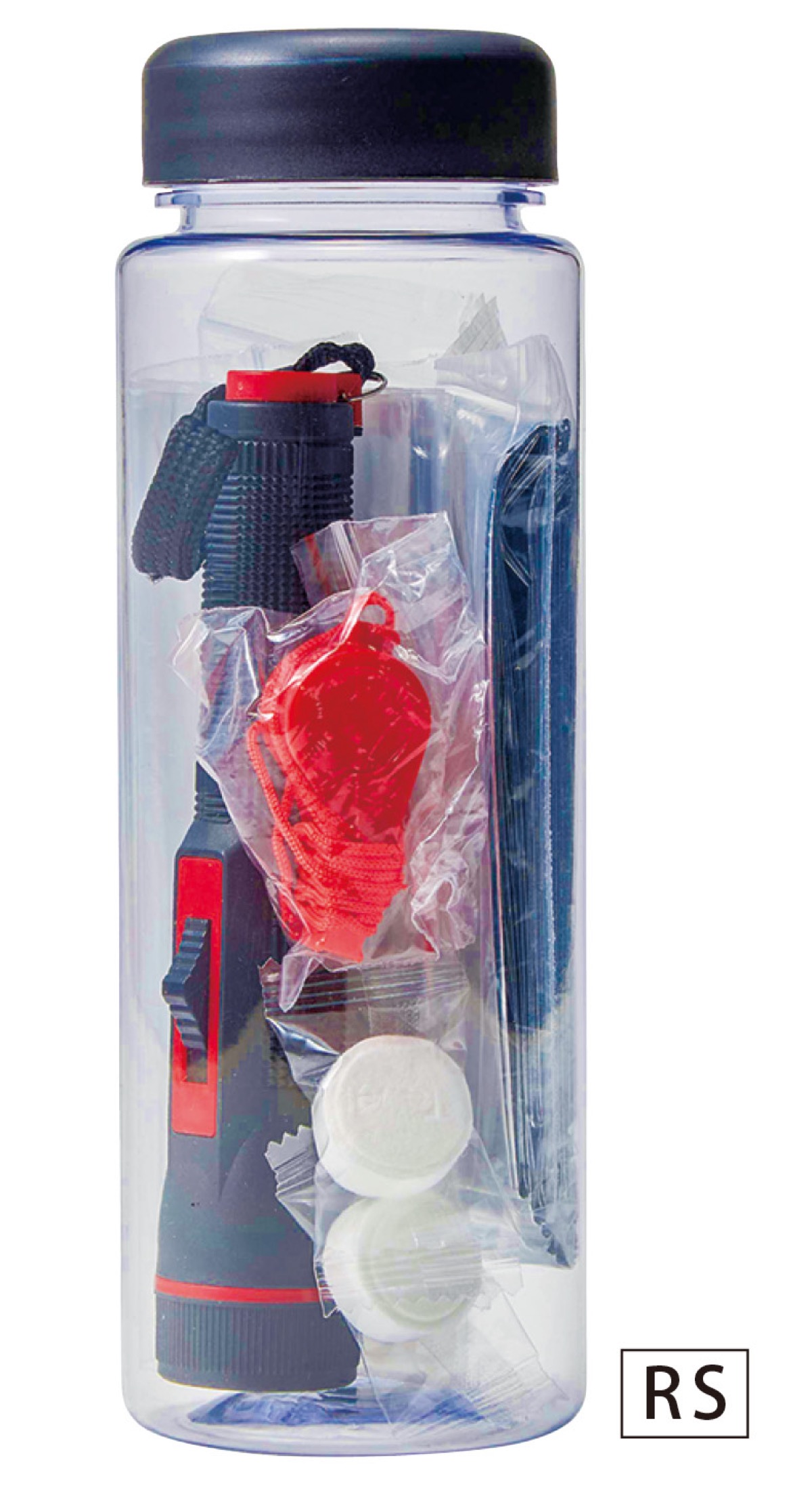 警視庁警備部災害対策課が公式SNSで投稿して以降、話題となっている防災ボトル。いつどこで遭遇するかわからない発災時に、すぐ役立つグッズ6点が1つのボトルにまとまっており、外出時にも持ち歩ける防災グッズとして注目を集めている。