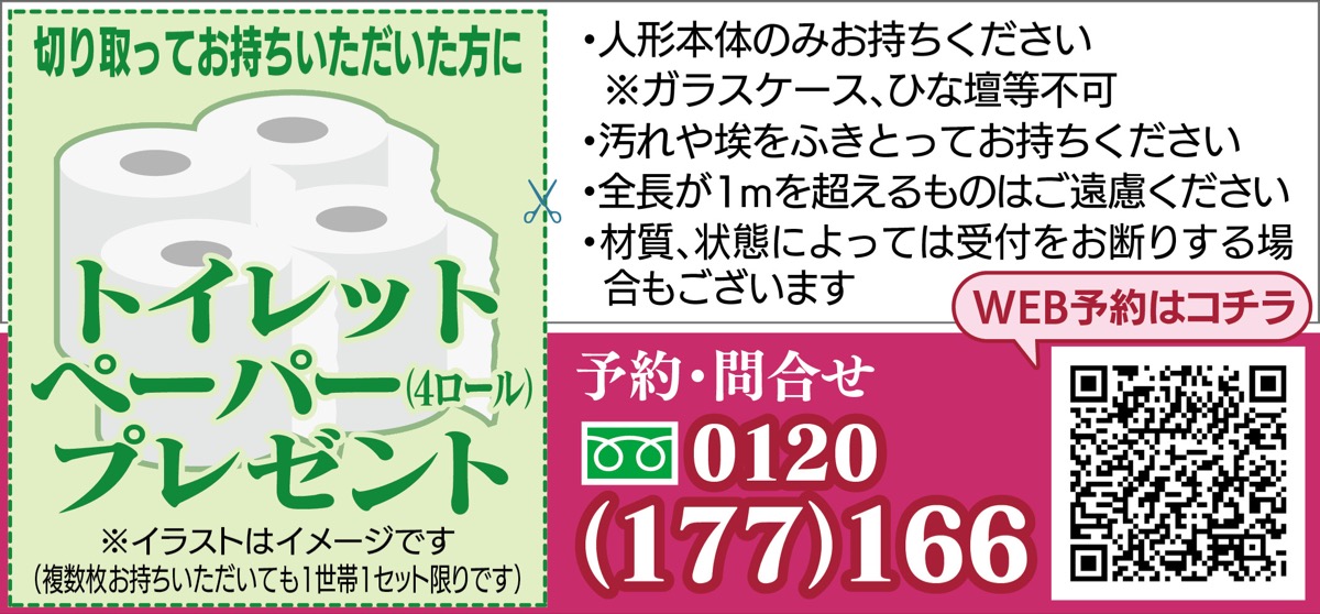 創業110周年の葬儀社・永田屋は、小さな家族葬ハウス上鶴間で人形供養祭を開催。9日(土)、10日(日)、14日(木)、15日(金)に人形の引取りを受け付ける。事前予約制。