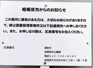 市では2年前に無縁墓の調査に着手。昨年度は基準を設け、通知や催告をしても返答のなかった区画には看板を掲げ、申し出を呼びかけている。市の担当者は「法的手続きを経て戸籍を調べ、親族を探すのはあまりに時間がかかる。無縁墓の改葬を簡略化できる仕組みができたが、行政として手続きを省くわけにはいかない」と苦悩を明かした。