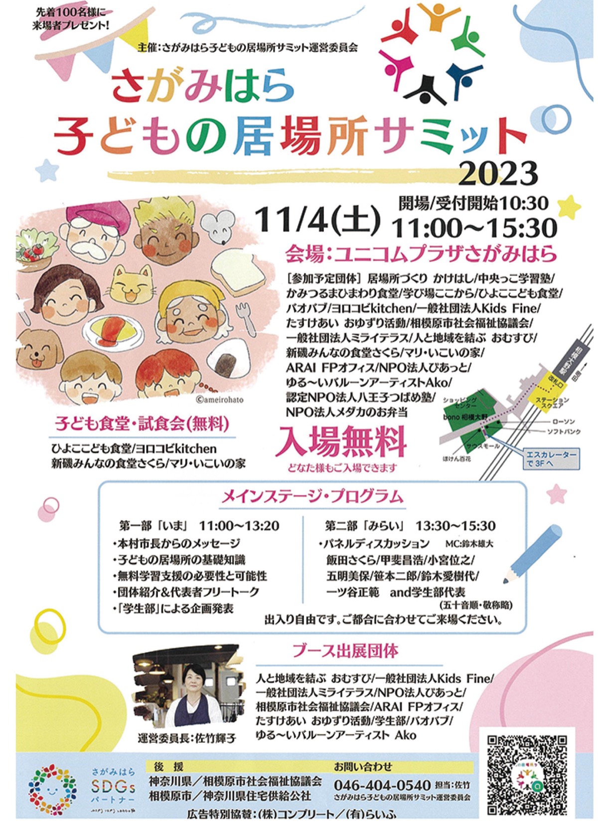 「さがみはら子どもの居場所サミット=画像」が11月4日(土)にユニコムプラザさがみはら(bono相模大野サウスモール3階)で開催される。主催は市内で子ども食堂や子どもの学習支援を行うメンバーで構成される同サミット運営委員会。入場無料で、午前11時から午後3時半まで(入退場自由)。