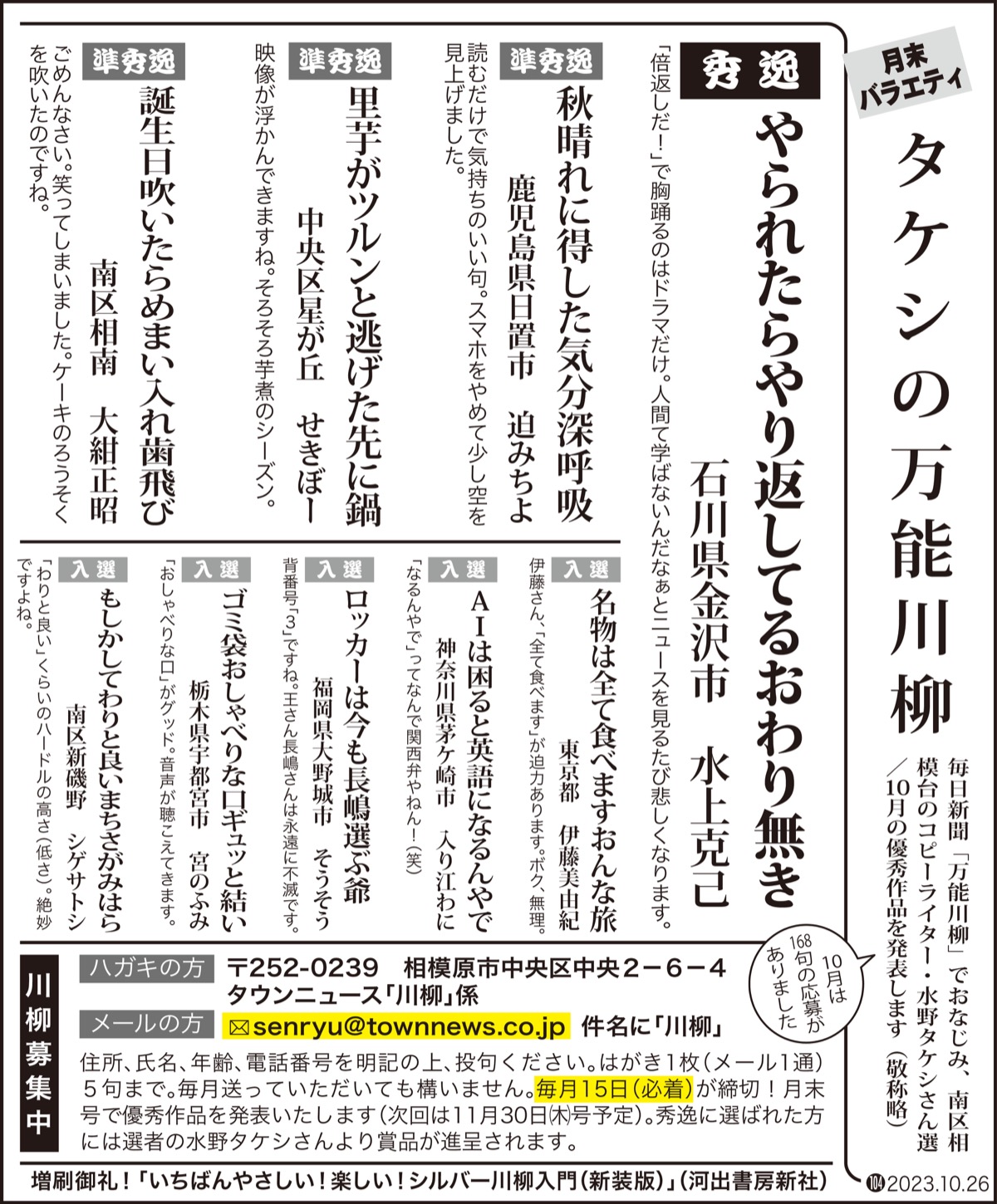タウンニュース相模原支社では毎月月末号に掲載される「タケシの万能川柳」の川柳を募集しています。投句いただいた作品は毎日新聞「仲畑流万能川柳」などでおなじみの水野タケシさんが選句します。応募方法は左記枠内に。