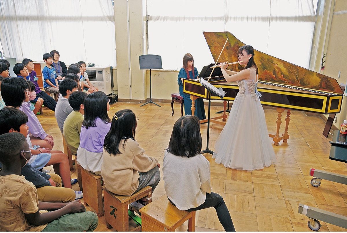 この日はチェンバロ奏者の加久間朋子さんとフルート奏者の鈴木菜月さんが同小を訪れた。二人は演奏を披露したほか、楽器の歴史や音の出る仕組みを紹介。鶯やカッコウを題材にした曲を披露し、何の鳥の鳴き声かを当てるクイズやリコーダーを吹く児童らと合奏など、さまざまな形で音楽の魅力を伝えた。