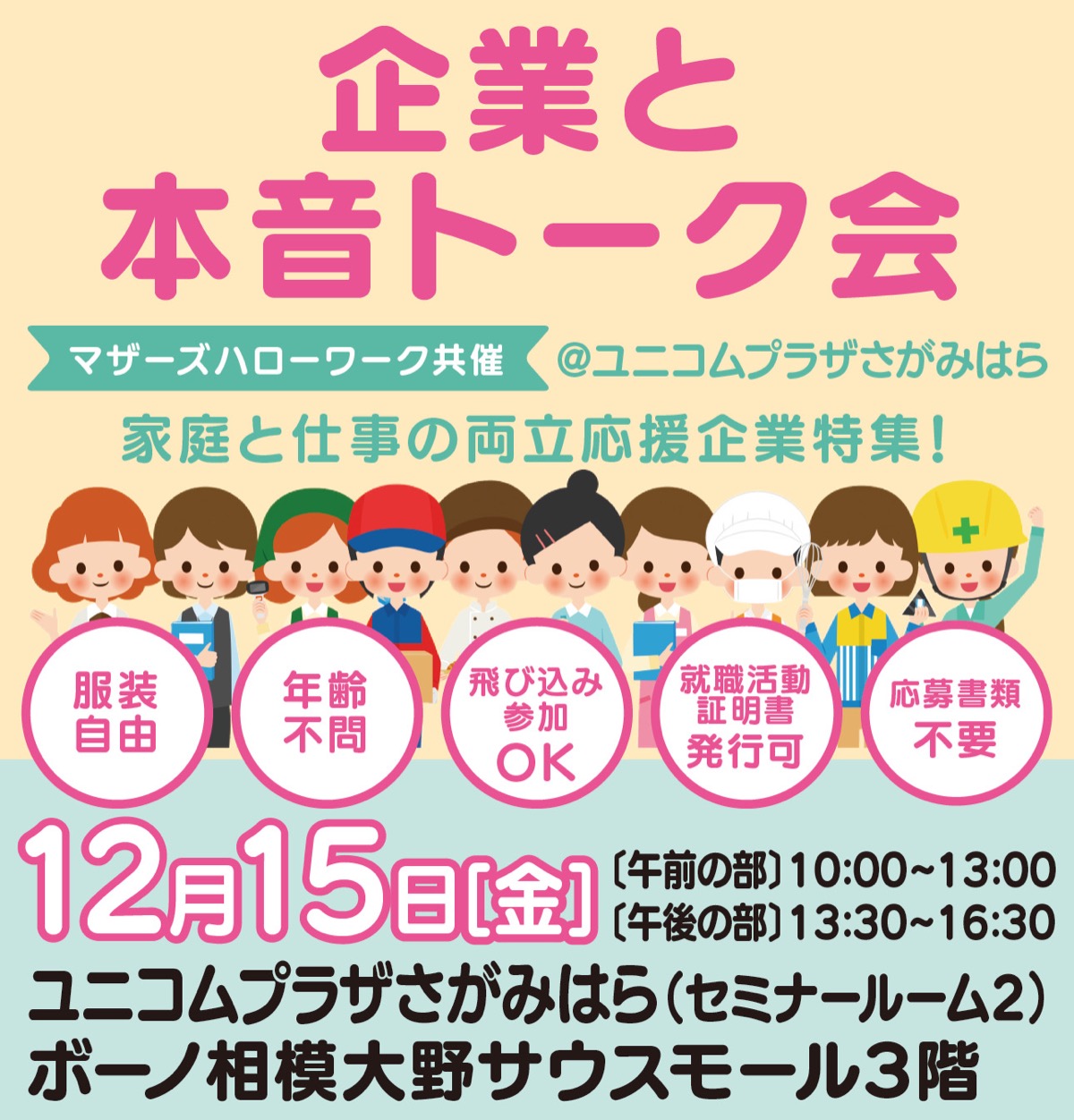 神奈川県はマザーズハローワークとの共催で12月15日(金)、育児や介護等で離職し、再就職を考えている人や、ワークライフバランス重視の就職活動を行う人を対象に企業説明会・座談会を開催する。会場は小田急線相模大野駅すぐ、ユニコムプラザさがみはら。午前(10時〜13時)、午後(13時30分〜16時30分)の2部制で、各3社程度が参加。企業PR後、企業ブースで座談会形式の質疑応答あり。希望者は面接も可能。