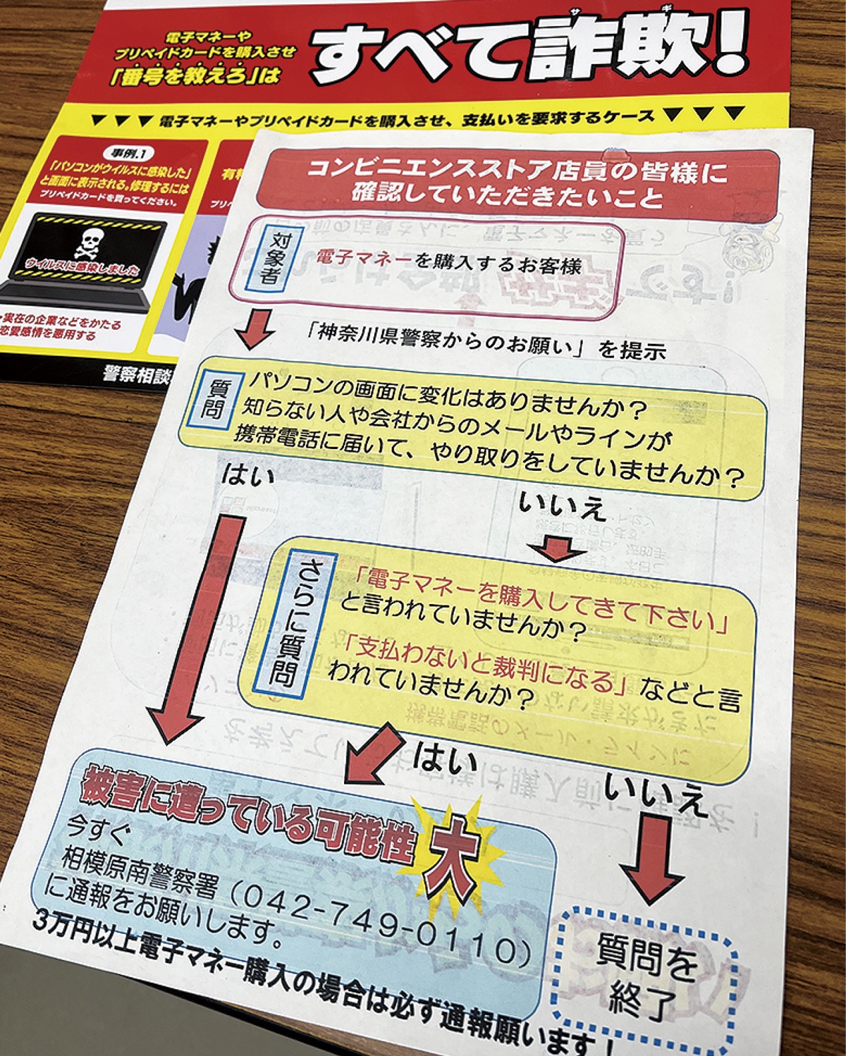 同店の白井孝博店長は「4、5万円分の電子カードを高齢者が購入するのは少し違和感。月に数件あり、最近特に頻発している。簡単に高額の金銭を取られるのは許せない。警察からも『空振りでいいから』と言われているので、怪しいと感じたらすぐに通報している」と語る。