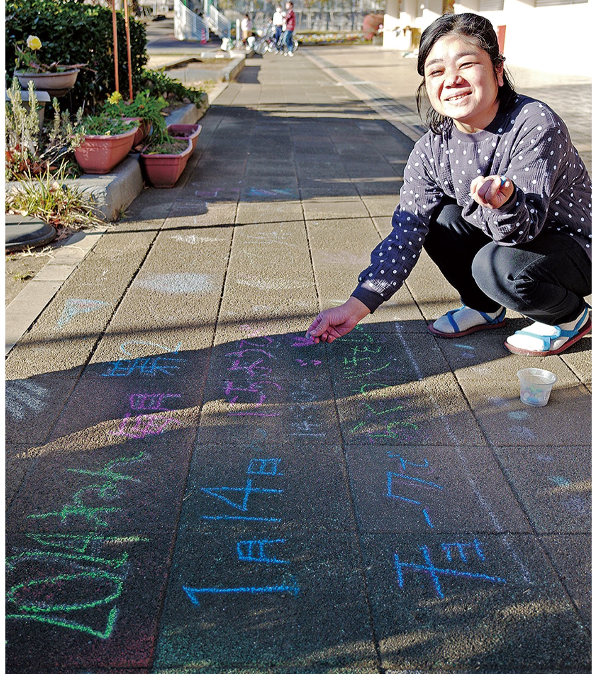 参加無料、出入り自由。翌日消すため同教室で販売するダストレスチョークのみ使用できる(10本660円)。福本さんは「気兼ねなく自由に描いてもらえれば」と呼びかける。(問)【メール】teracoyart@gmail.com