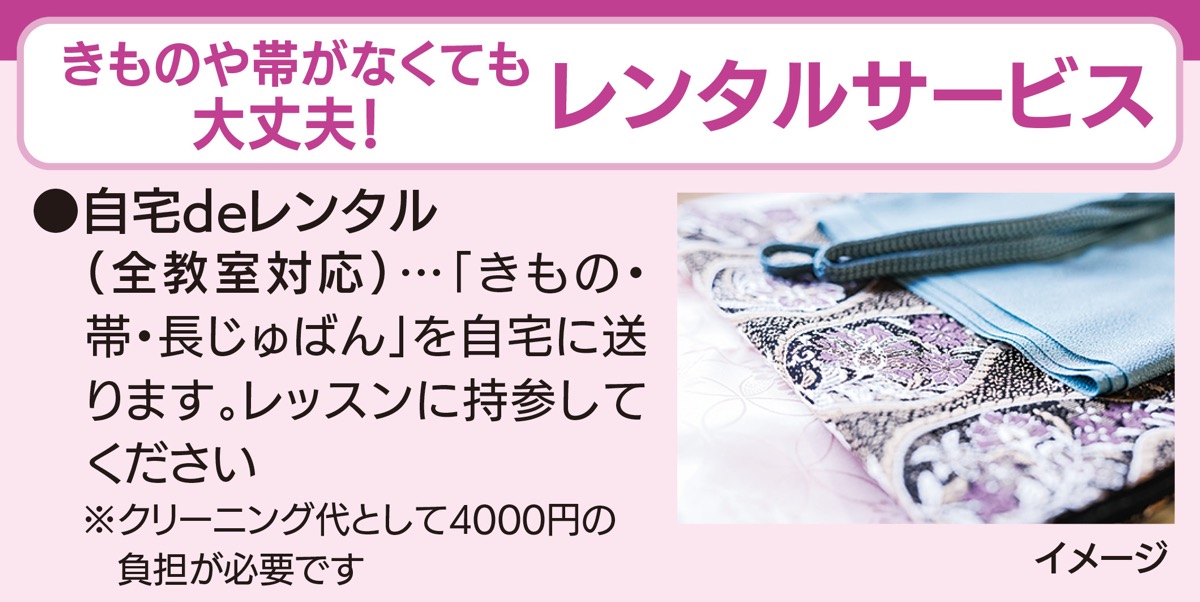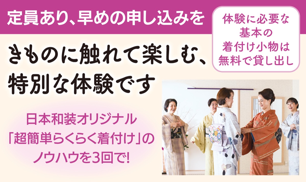 「きものって想像より、手順が少なく覚えやすい」「帯結びって案外、簡単」「やっぱりきものって華やか」などの新発見に出会えるかも。期間限定で定員制のため、この機会に早めの問い合わせを。
