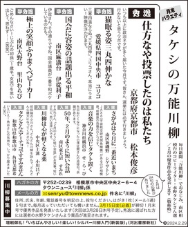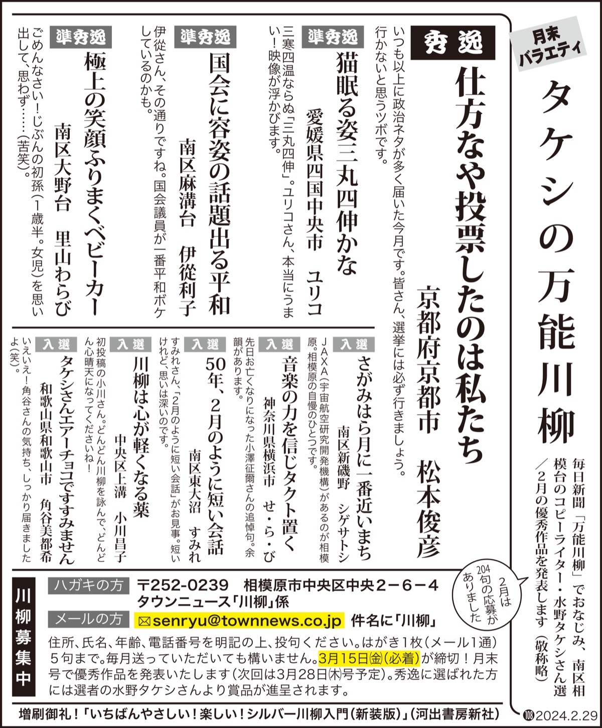 タウンニュース相模原支社では毎月月末号に掲載される「タケシの万能川柳」の川柳を募集しています。投句いただいた作品は毎日新聞「仲畑流万能川柳」などでおなじみの水野タケシさんが選句します。応募方法は左記枠内に。