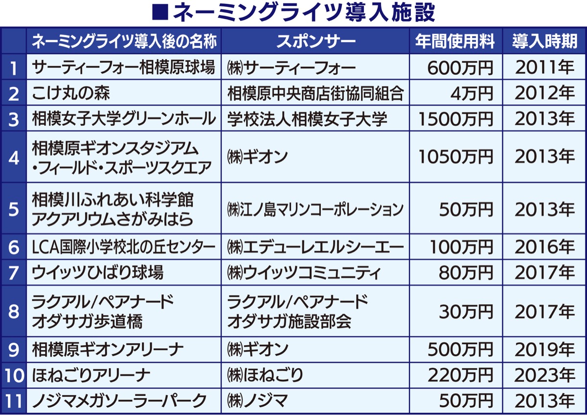 スポーツ・文化施設などの名称にスポンサー企業の社名や商品名を付与する権利を売却し、財源確保に充てる「ネーミングライツ制度」。相模原市では2011年に相模原球場で導入して以降、文化会館や科学館、体育館でも導入してきた。