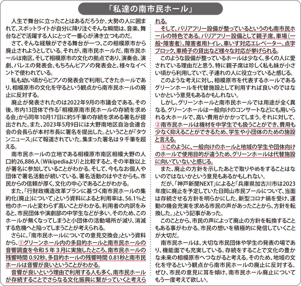 区内在住の中学3年生(当時2年)・藤生奈那さんから2026年3月末に廃止される相模原南市民ホールについて、左のような投書が本紙に届いた。投書に基づき、市文化振興課に現状を聞いた。